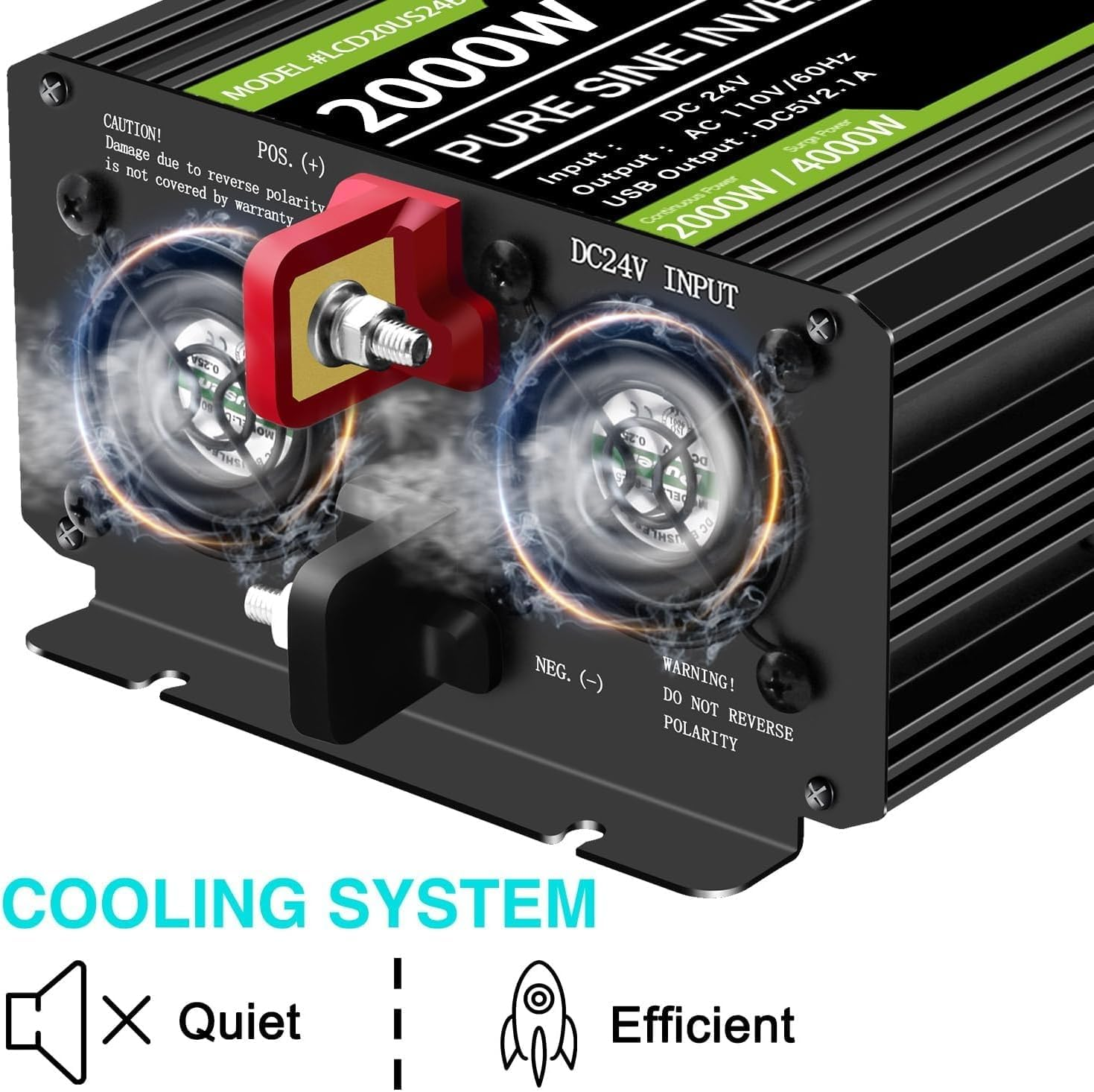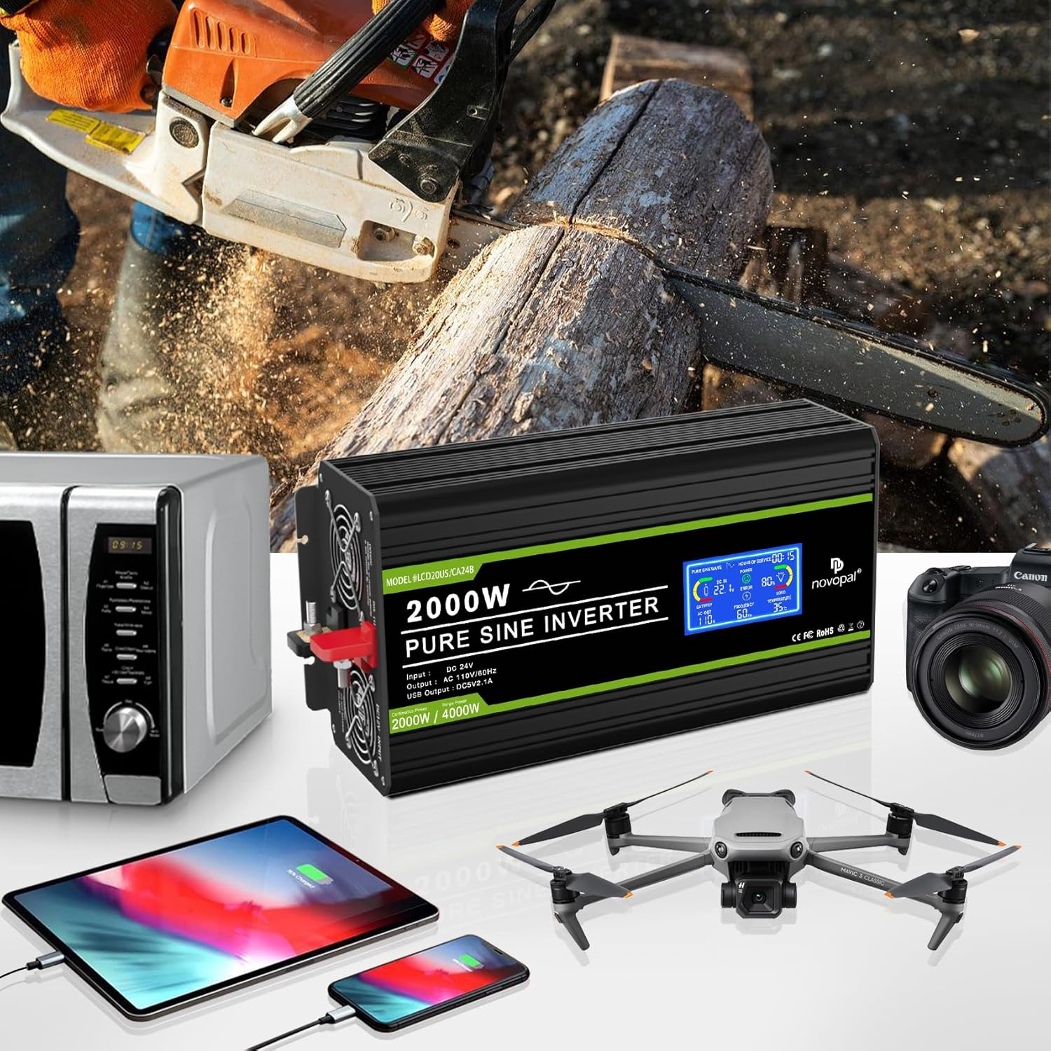 - 【novopal Pure Sine Wave Inverter】Famous power inverter brand. Converts 24V DC to AC 110V /120V household wall power with continuous 2000w output ( 4000w surge capability). features with 4 AC receptacles, one 2.1A USB port,high current DC terminals and a wired remote control (16.4 feet in length), digital LCD display.
