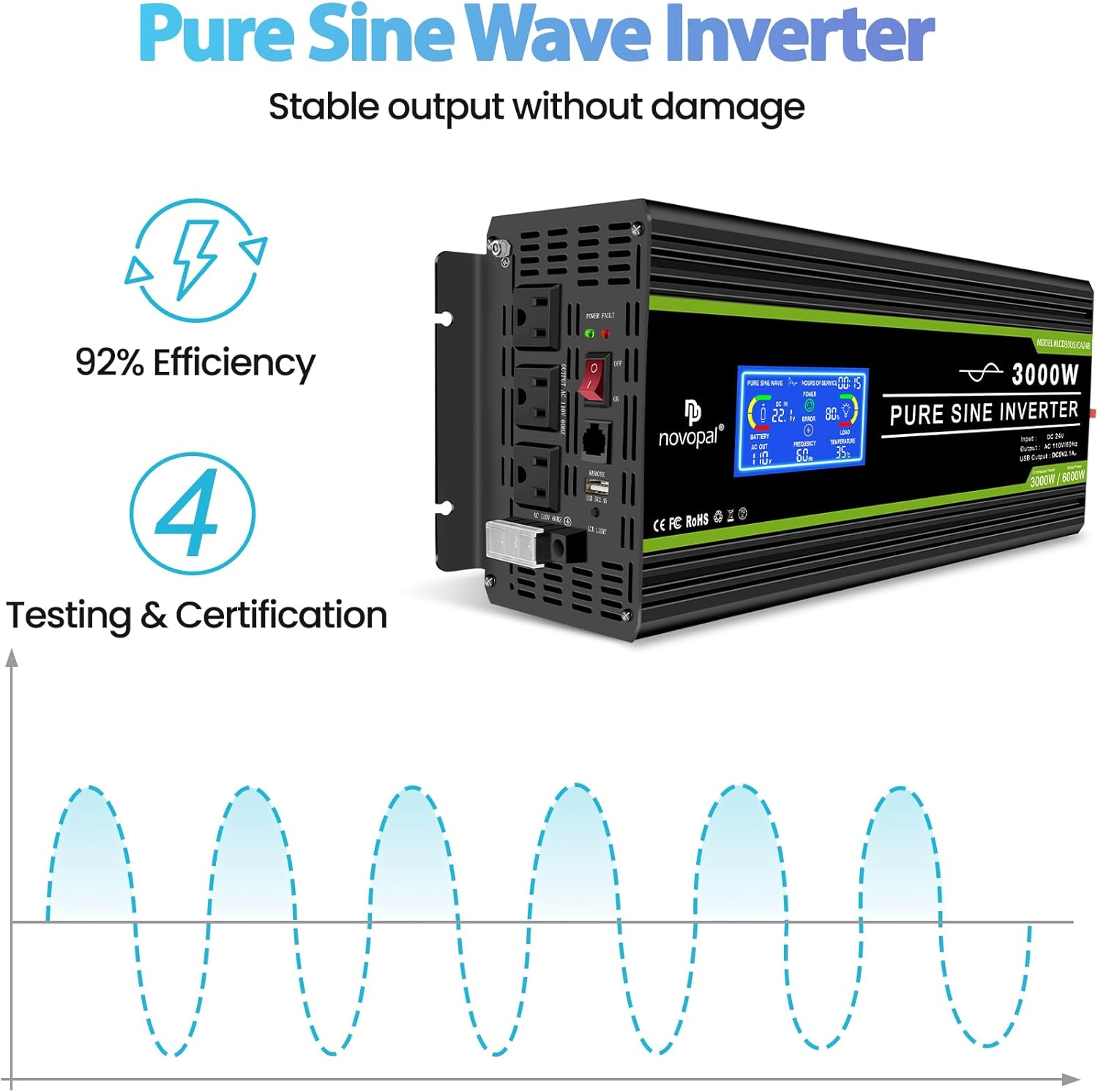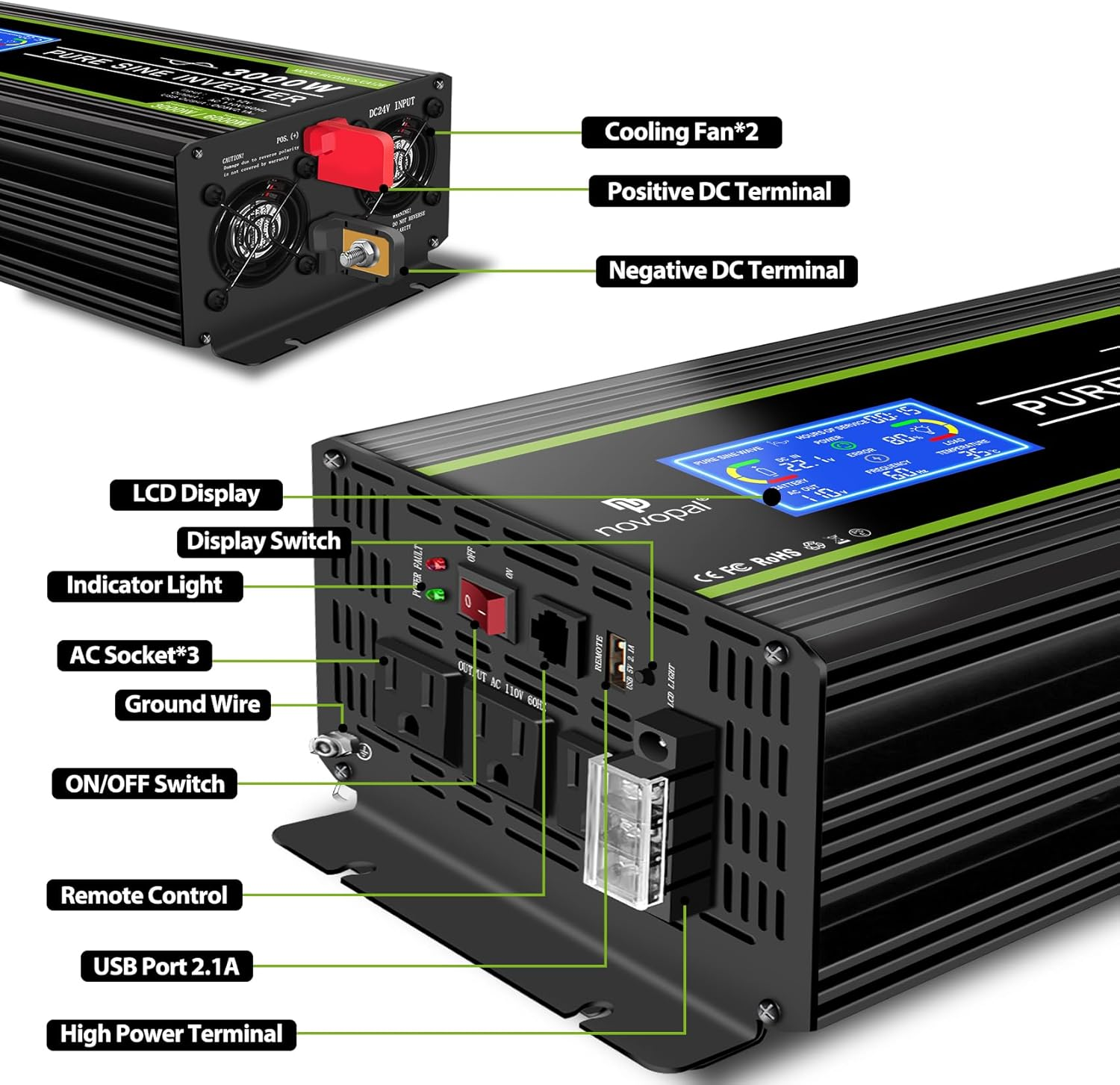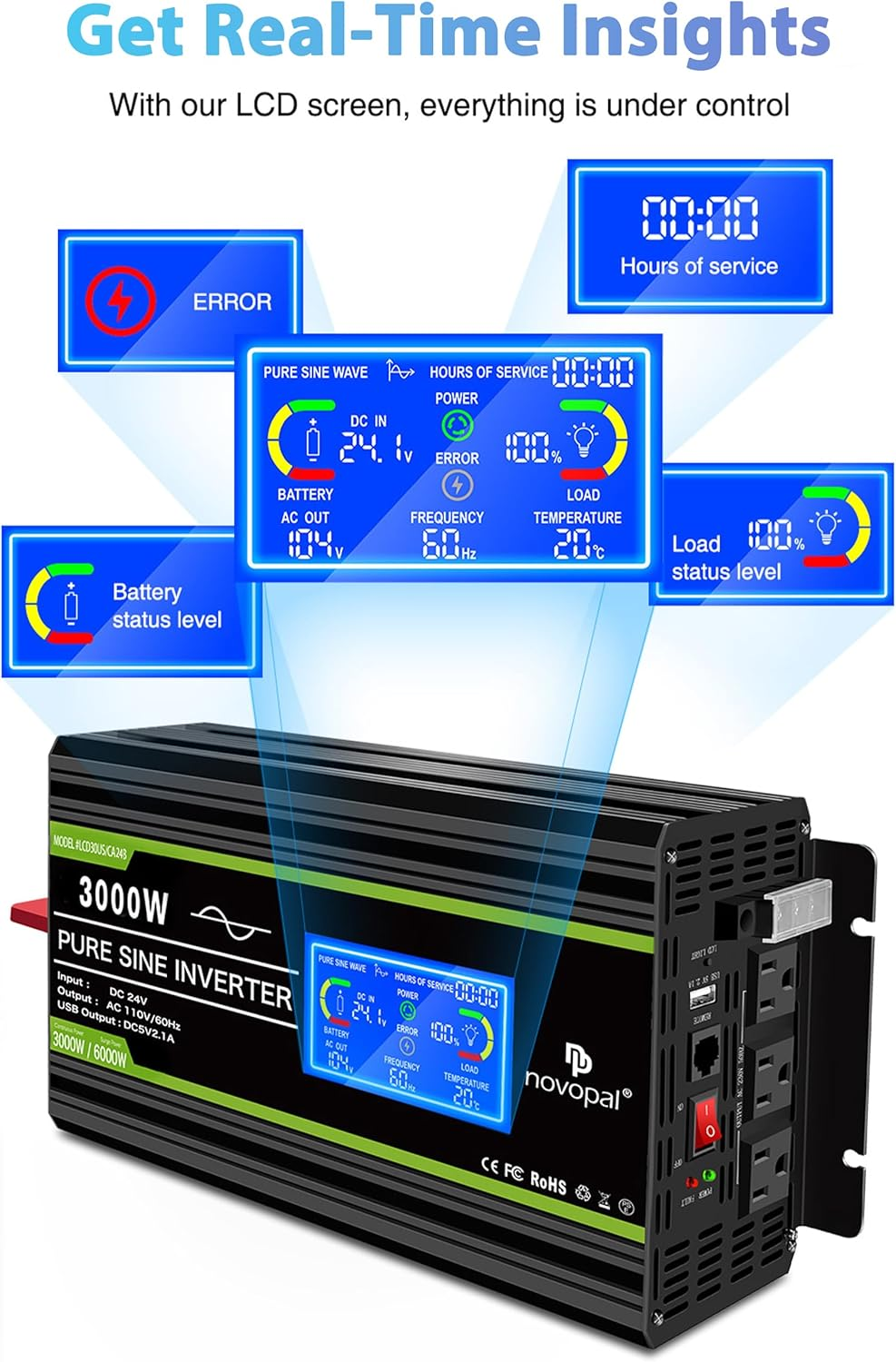 - 【 Pure Sine Wave Inverter】- 3000 watts continuous power/6000 watts peak power, 24V DC to 120V AC, high output AC terminals, remote switch,3 output sockets, 1 USB port and LCD display, ideal for most appliances and sensitive equipment.
