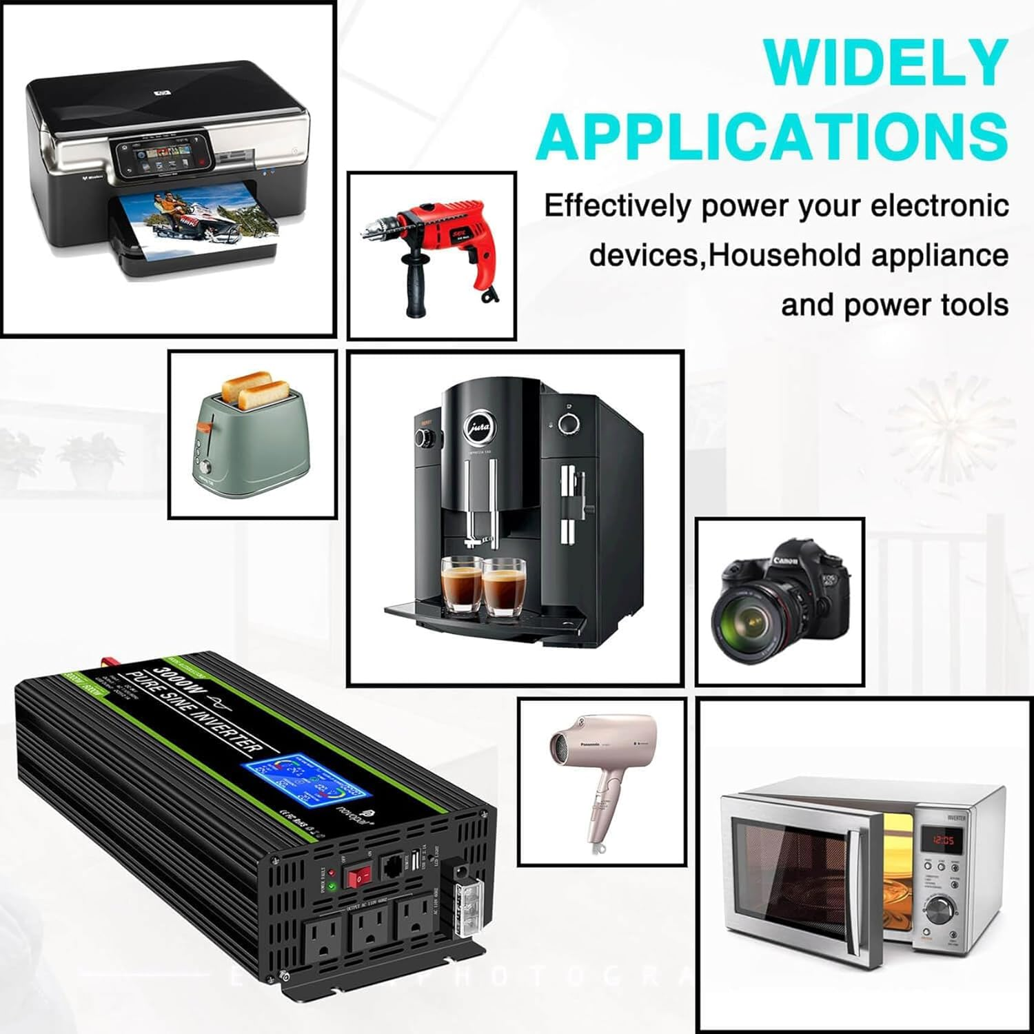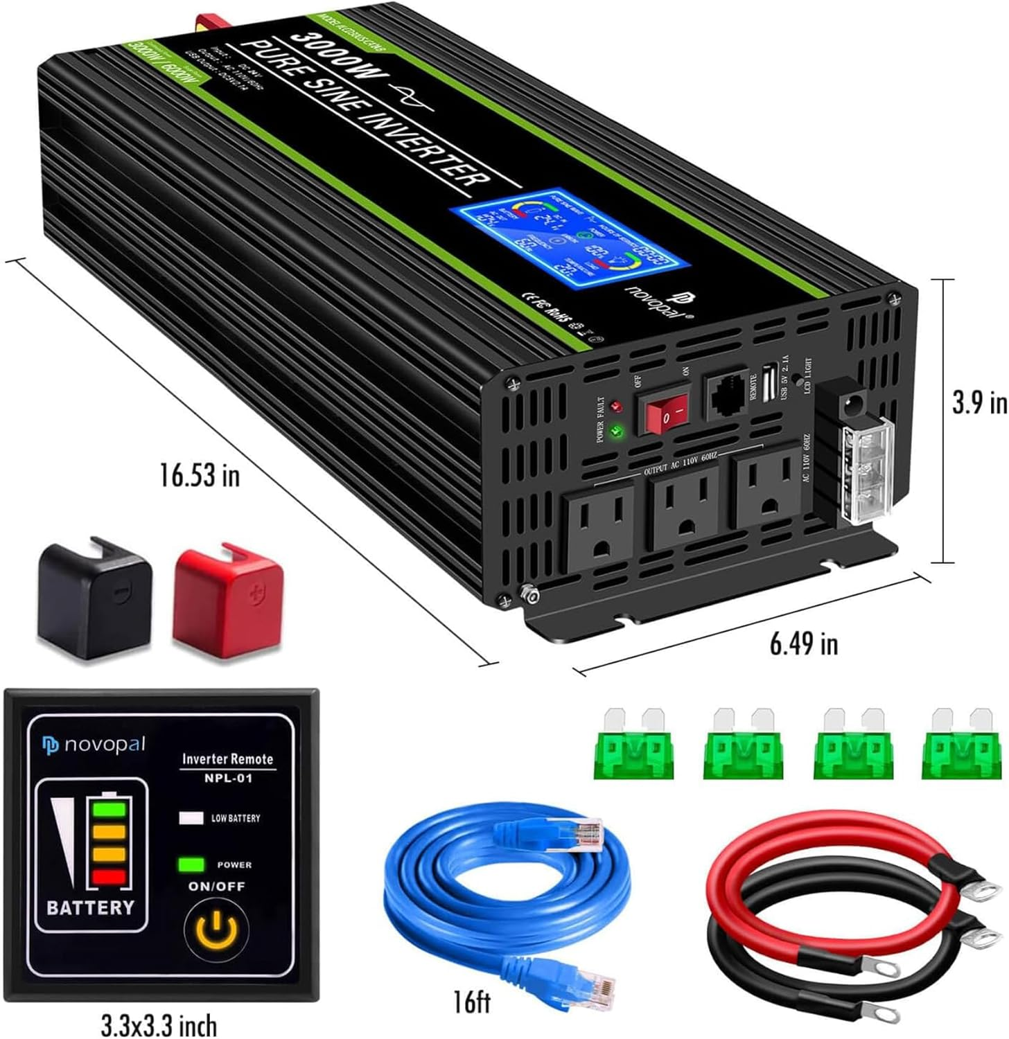 Novopal pure sine wave 3000w inverter provides household power on the go! It converts battery power DC 12V to AC 110/120V household power, allowing you to power up multiple loads such as office equipments and major household appliances from your vehicle. This unit is ideal for Cameras, computers, drones, fans, hair dryers, refrigerators, angle grinders, washing machines,TV sets, video games, CD players, DVD players, cellular phone chargers and much more!