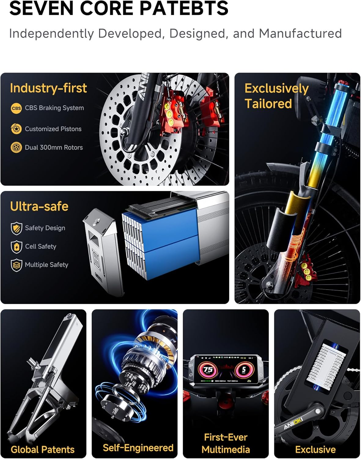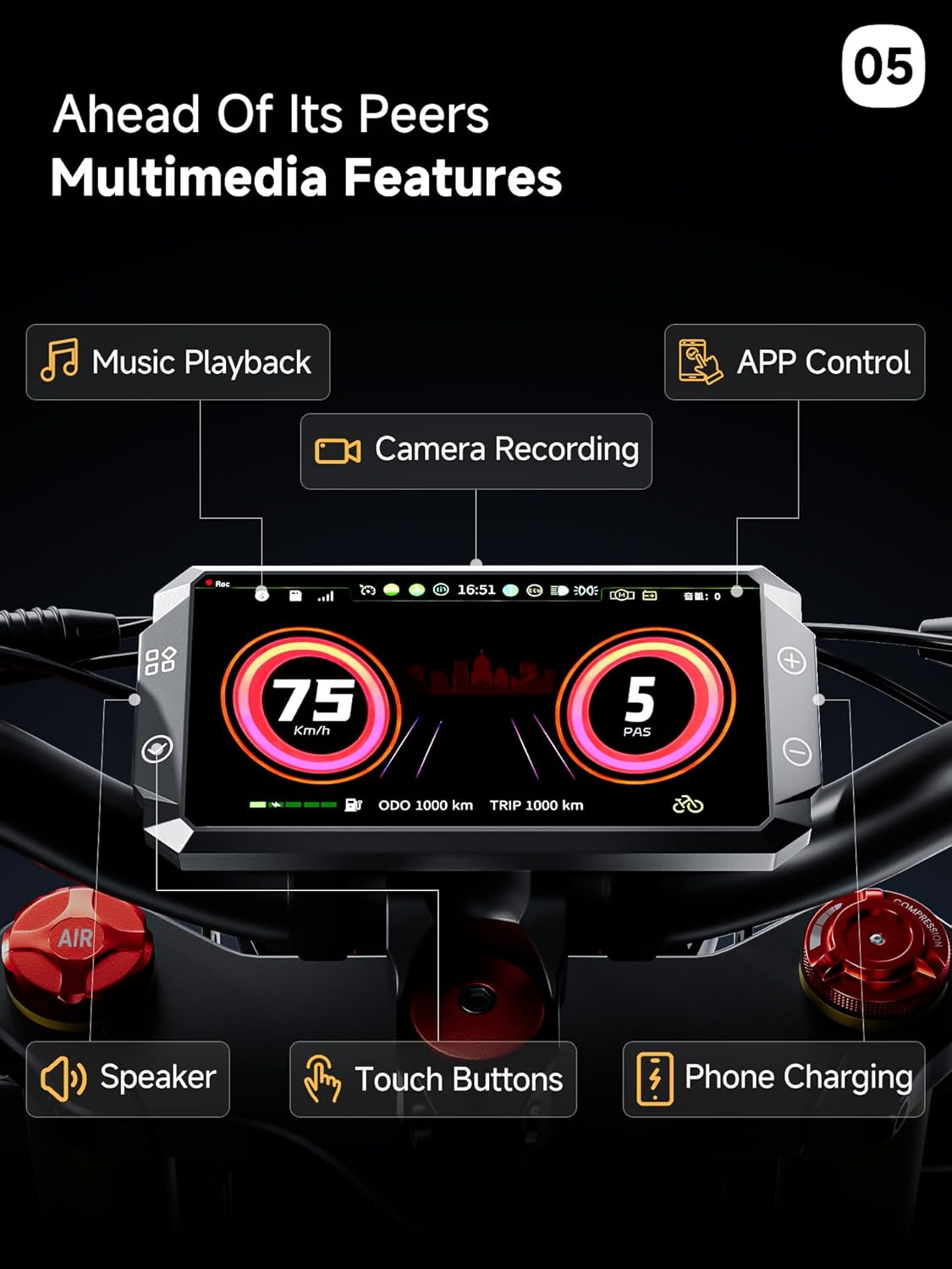Equipped with dual 60V 35A controllers, the A9 PRO MAX ensures smooth power distribution, while its industry‑leading braking system—a Combined Braking System (CBS) paired with dual front disc brakes—delivers unmatched stopping power and rider confidence. A 5‑inch multifunction display adds app control, music, and phone charging, blending tech with style.