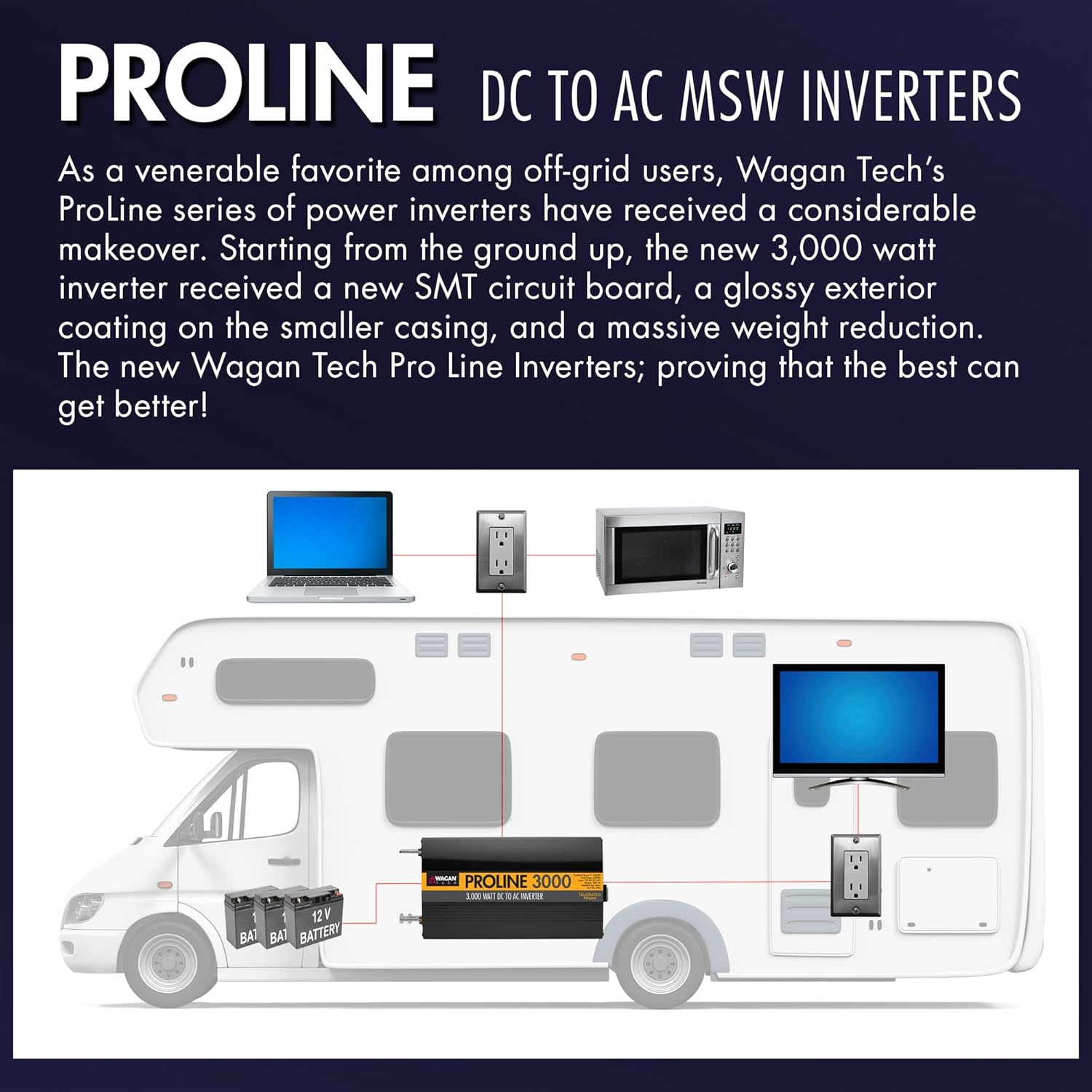 As a venerable favorite among off-grid users, Wagon Tech’s Pro Line series of power inverters have received a considerable makeover. Starting from the ground up, the new 10, 000 watt inverter received a new SMT circuit board, a glossy exterior coating on the smaller casing, and a massive weight reduction. The new SMT (Surface Mount Technology) circuit boards offer greater reliability, better efficiency, and fewer stray RF emissions over the older PCB (Printed Circuit Boards) and through-hole boards. From there the case volume shrunk almost 50% of the original, and the overall weight was reduced 48%! This makes for one efficient, reliable, beautiful, and lightweight 10, 000 watt inverter in a more compact size! On the front of the Pro Line 10, 000 Watt Inverter you will find the manually operated power switch (On/Off) as well as the jack for the remote power switch (included). 4 conveniently stacked 120V AC outlets capable of providing 1500 watts each are well spaced on the right side of the inverter. Just left of the AC outlets, you will find the LED Over-Load and Over-Temperature warning lights and the Voltage and Amperage level indicators. With the stout AC terminal block just below the Voltage/Amperage Level indicators, you can be certain that your investment is well protected. On the backside of the Pro Line 10, 000 Watt Inverter is the massive cooling fan, the Heavy Duty Solid Mount Positive (Red) Terminal, the Heavy Duty Solid Mount Negative (Black) Terminal, and the Ground-Neutral Bond stud with wing-nut. Both of the Terminals are now Heavy Duty Sold Mounts and come directly out of the case to make connections easier and to avoid the inevitable 90ᵒ bend that the cables make on traditional inverters; causing undue stress and making connections harder. The massive cooling fan is utilized to help keep the inverter cool and operating efficiently. The new Wagon Tech Pro Line Inverters; proving that the best can get better.