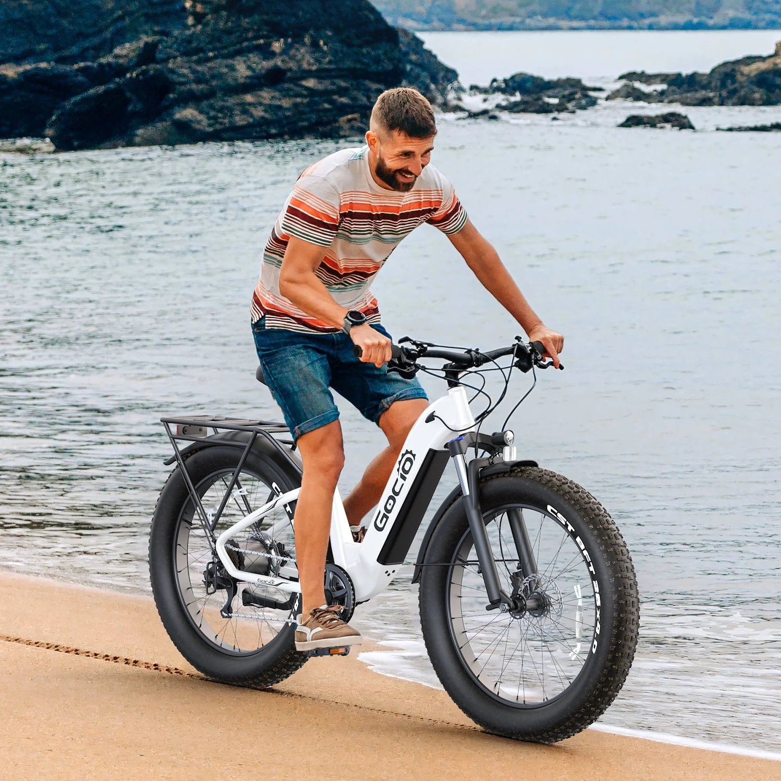 The Gocio 26″ Fat Tire Electric Mountain Bike is designed to handle city streets, rough trails, and everything in between. Its 750W brushless motor provides powerful acceleration and a top speed of 22 mph, while the 48V 15Ah removable lithium‑ion battery (UL 2849 certified) delivers a range of 30–45 miles in throttle mode or up to 45–60 miles with pedal assist. A sturdy aluminum alloy frame with new TIG technology gives a clean, modern look. The suspension fork and fat 26″ × 4.0″ tires absorb bumps with ease, and the Shimano 7‑speed drivetrain lets you adjust for different riding conditions.