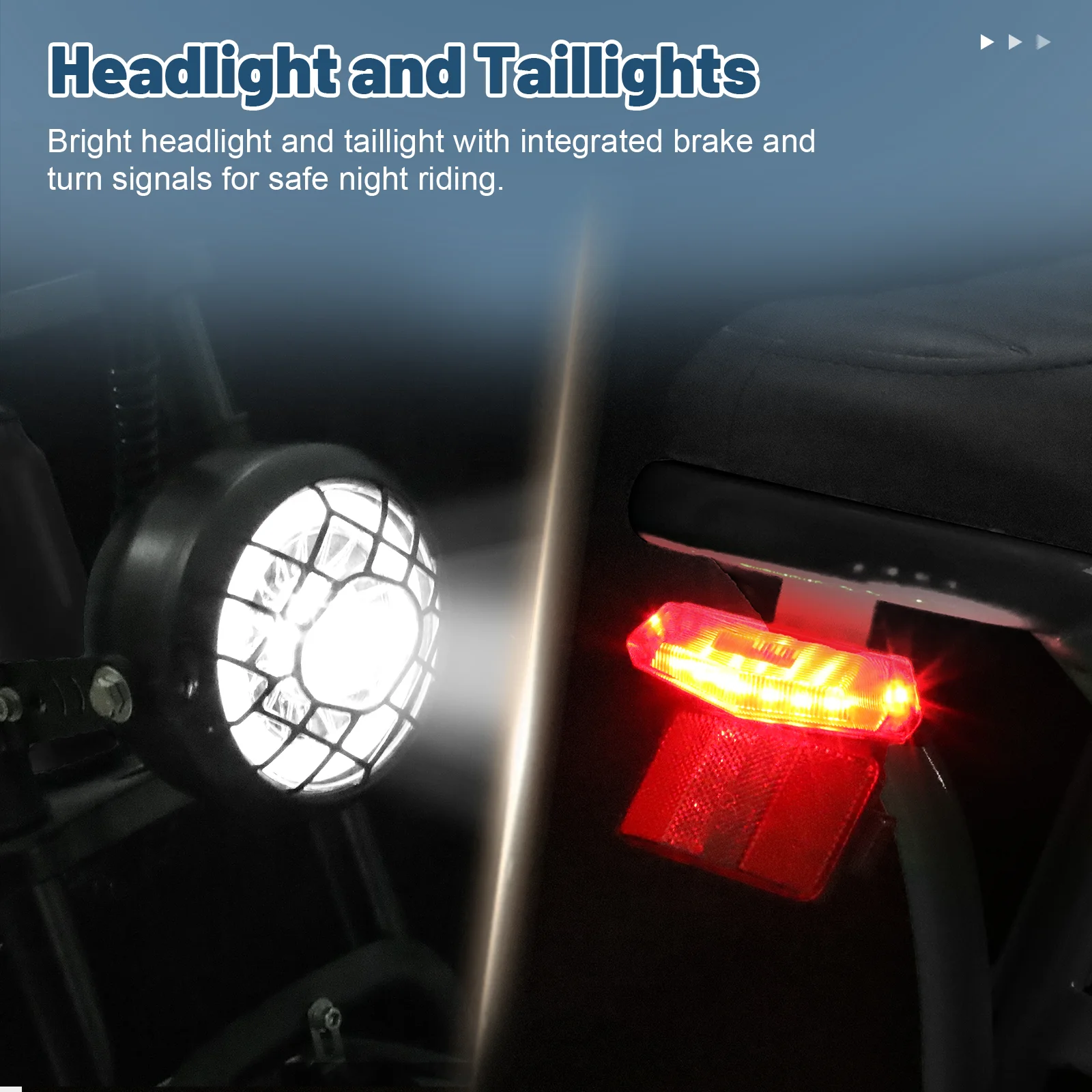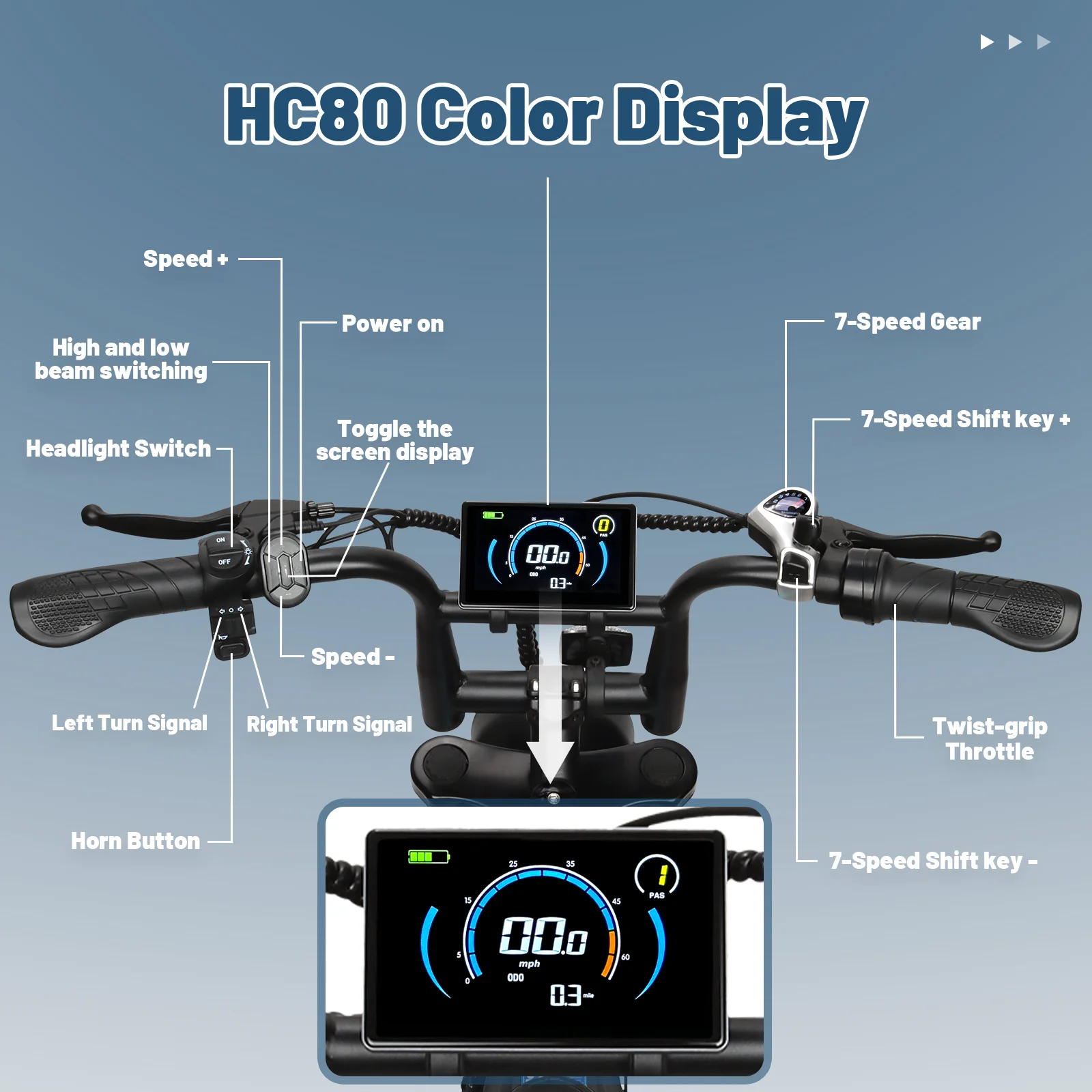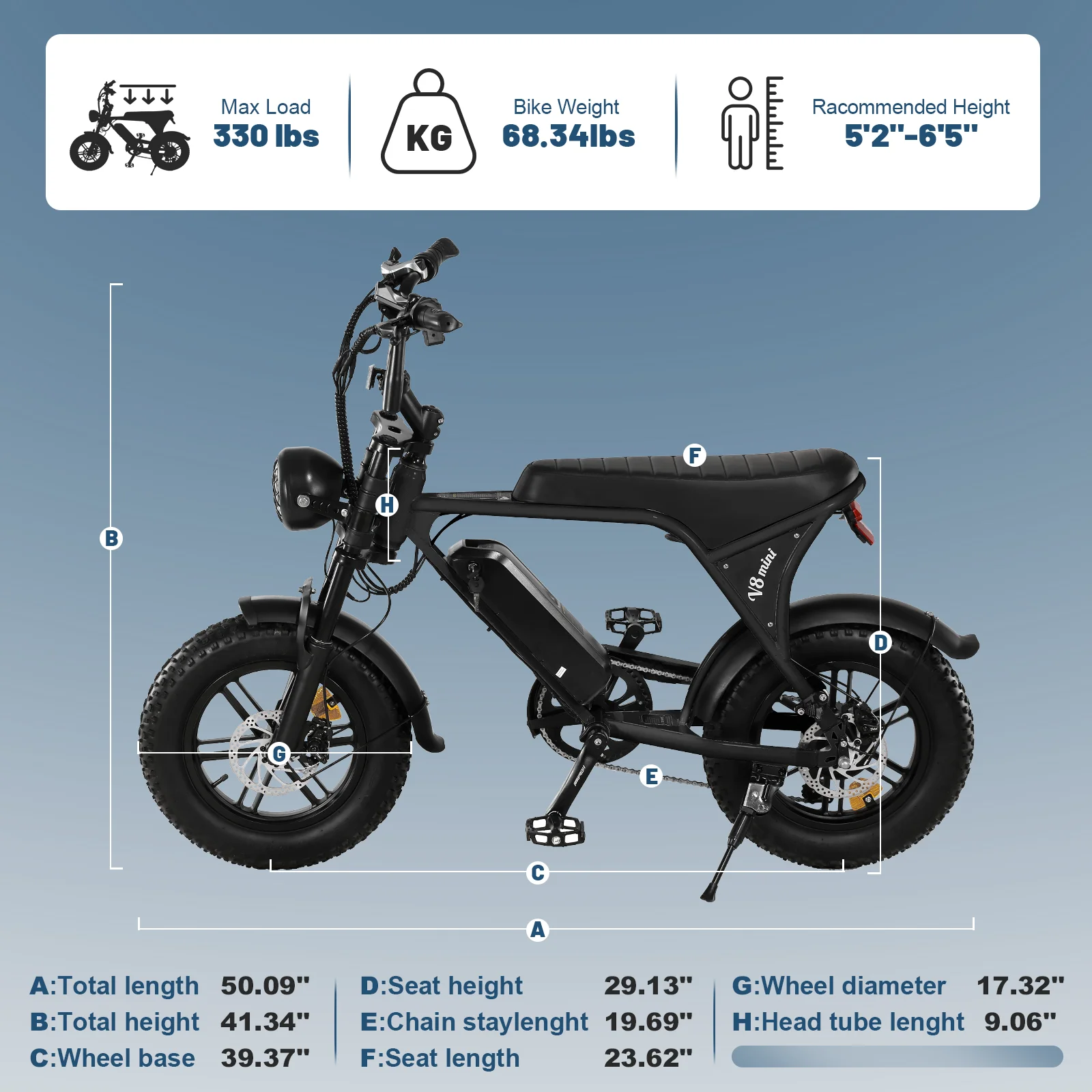 The OUXI V8 Mini Electric Bike is a stylish and practical e‑bike built for commuting, leisure riding, and fun adventures. It is powered by a 500W brushless motor paired with a 36V 10.4Ah removable battery, delivering smooth propulsion and a maximum speed of 20 mph. With a full charge in 5–6 hours, you can ride between 24 and 28 miles depending on terrain and assist level. Its 16″ fat tires and front suspension absorb bumps for a comfortable ride, while a colorful HC80 LCD display shows speed, battery level, and mileage in real time. Certified to UL2849 standards and equipped with dual disc brakes and front/rear lights, this e‑bike is built with safety and reliability in mind.