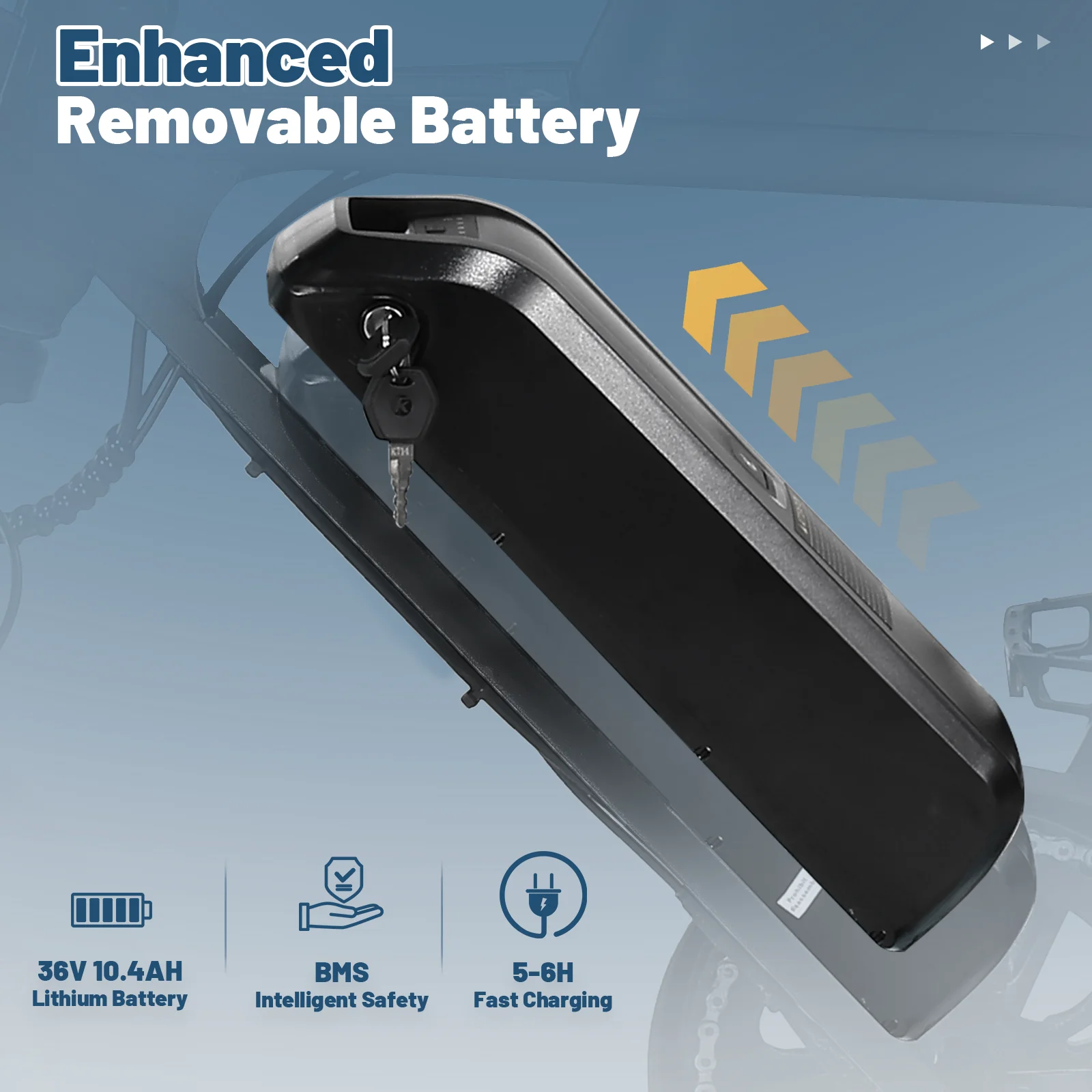 Battery: 36V 10.4Ah, removable, charges in 5–6 hours