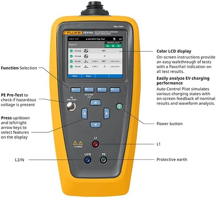 The FEV150/TY1 PRO is a professional-grade analyzer designed to test the safety and functionality of AC EV charging stations. It simulates EV charging conditions using an Auto Control Pilot and displays waveform and nominal test results. Integrated with TruTest Software; it allows direct transfer of measurements to a PC for reporting and comparison. The analyzer performs PE pre-tests; GFCI checks; voltage tests; pilot signal analysis; and error simulations. Designed for technicians and engineers; this tool ensures thorough safety validation and performance verification of EVSE installations.