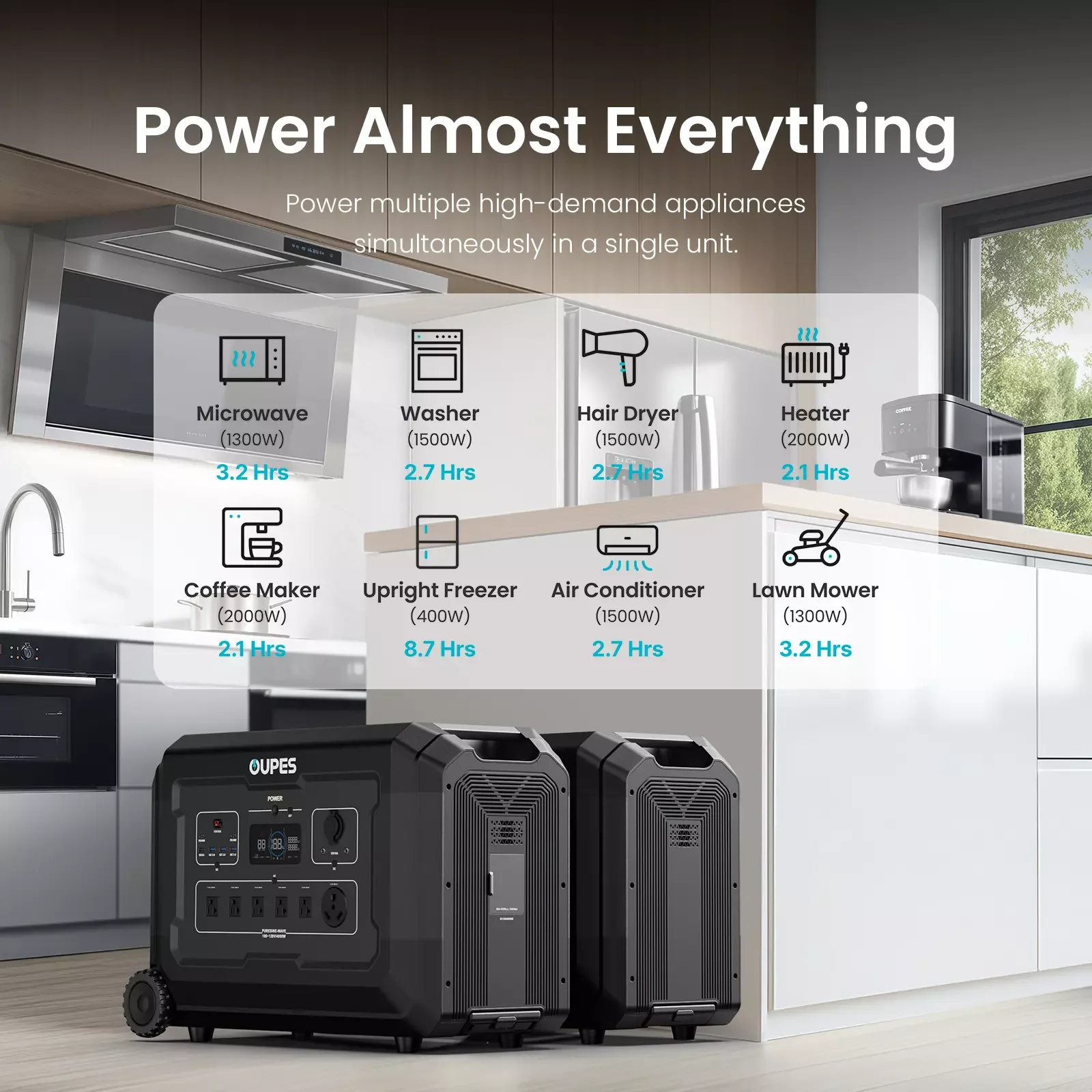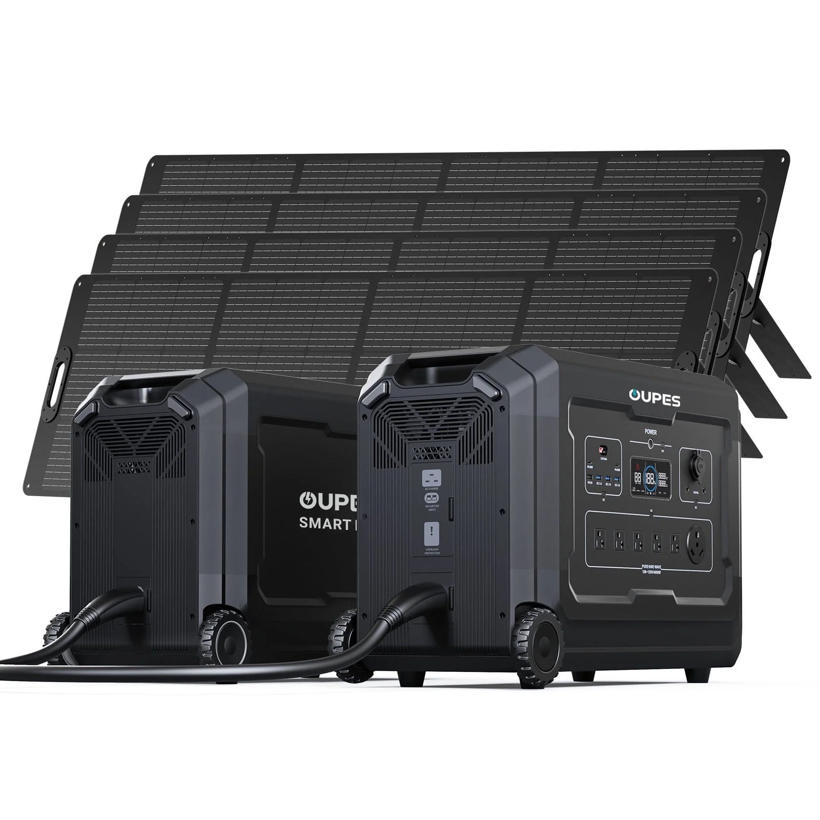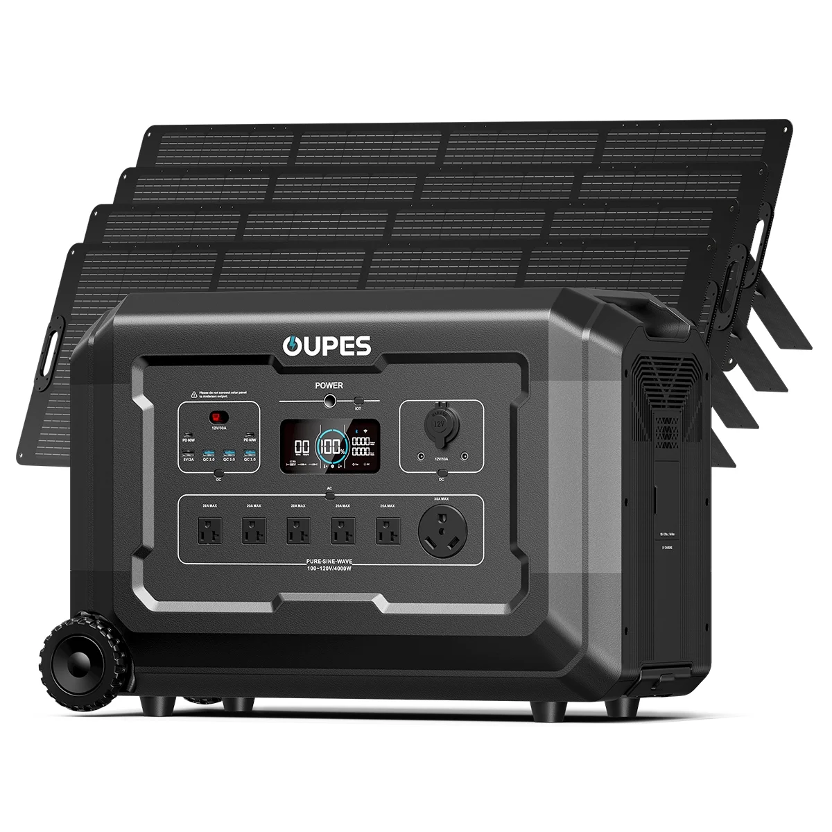 The Mega 5 Power Station integrates a 5040Wh LiFePO4 battery with a 4000W pure sine wave inverter (7000W surge) to supply stable, high‑capacity power for home backup, RVs, and outdoor projects. With 8×240W solar panels included, it delivers a total of 1920W solar input, and with the included B5 expansion battery it reaches a total capacity of 10.08 kWh.