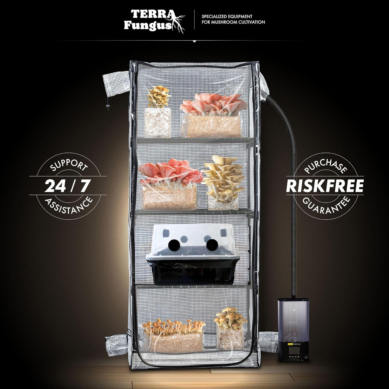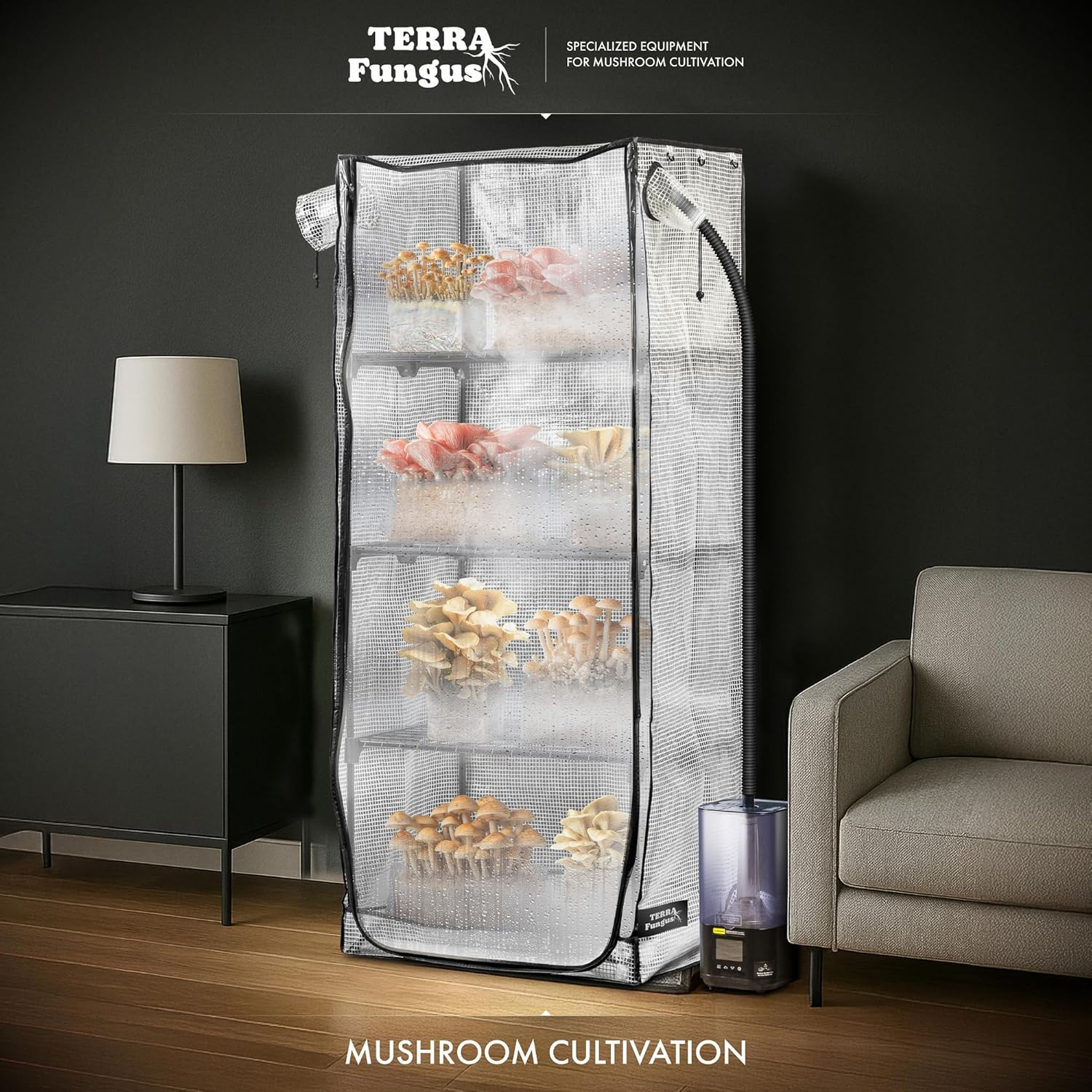 This mushroom grow tent provides a controlled environment for cultivating mushrooms and other plants indoors. Measuring 65″ × 27.5″ × 20″, it offers a small footprint with large capacity. The structure is built with heavy‑duty materials, vents, and an optional 6500K full‑spectrum grow light with a 12‑hour on/off timer. It is designed to fit a monotub and additional accessories like a humidifier or fan, making it suitable for both beginners and experienced growers.