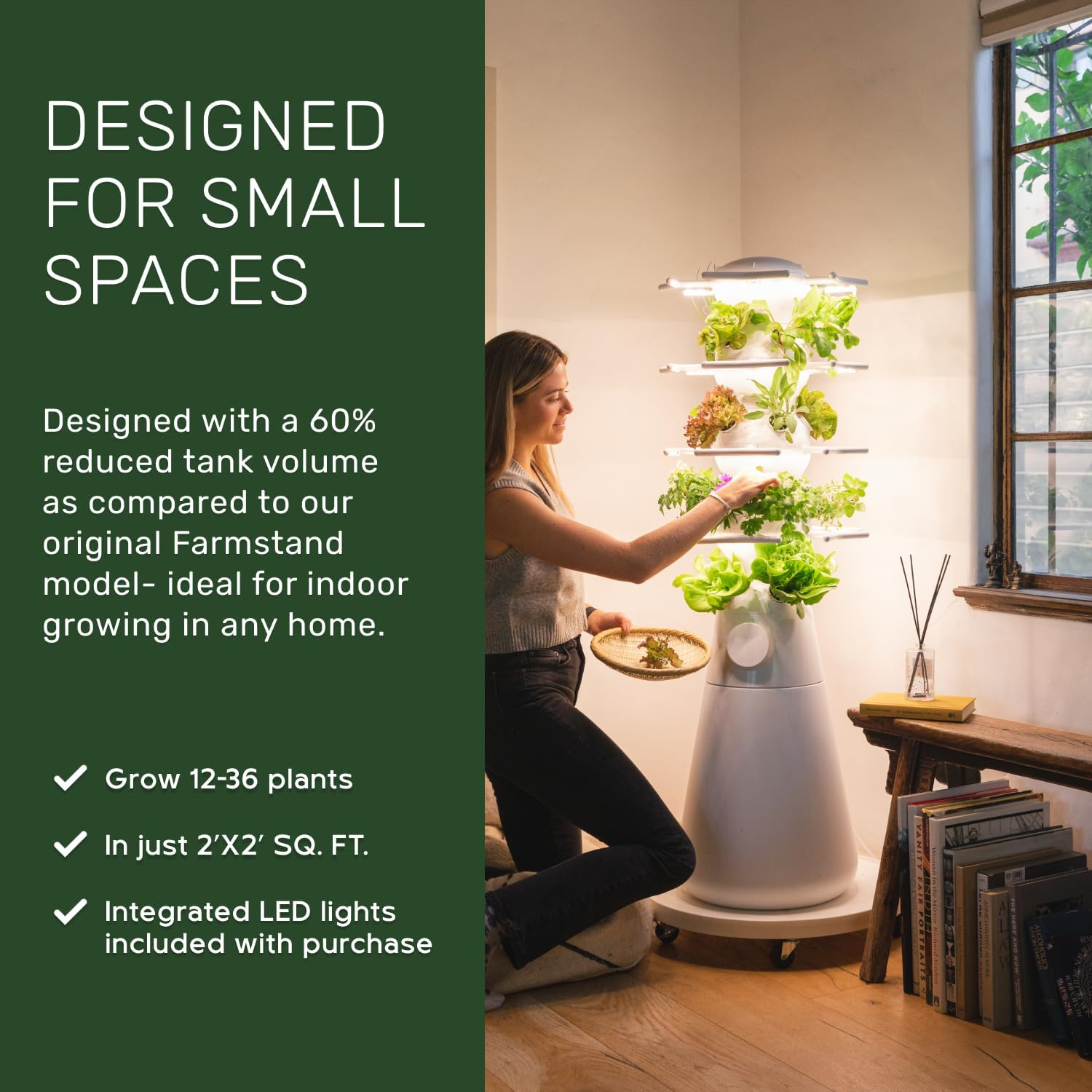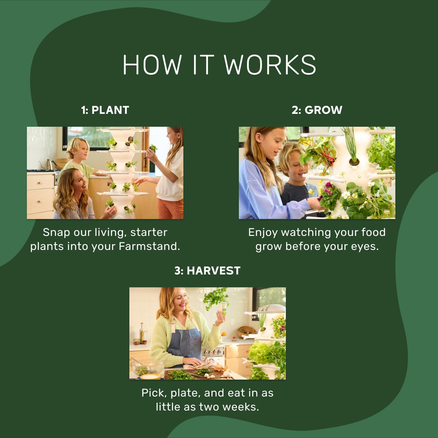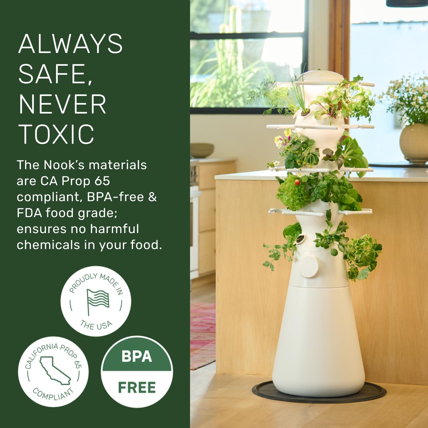 The Farmstand Nook is designed to grow fresh produce year‑round in even the smallest spaces. Its advanced hydroponics system requires only minutes per week to add water and nutrients, with automated water distribution ensuring every plant thrives without soil or mess. Integrated LED lights and a smaller tank make this system perfect for kitchens or apartments. With 95% less water usage than traditional gardening and a footprint that fits virtually anywhere, the Nook delivers sustainable, homegrown food in style.